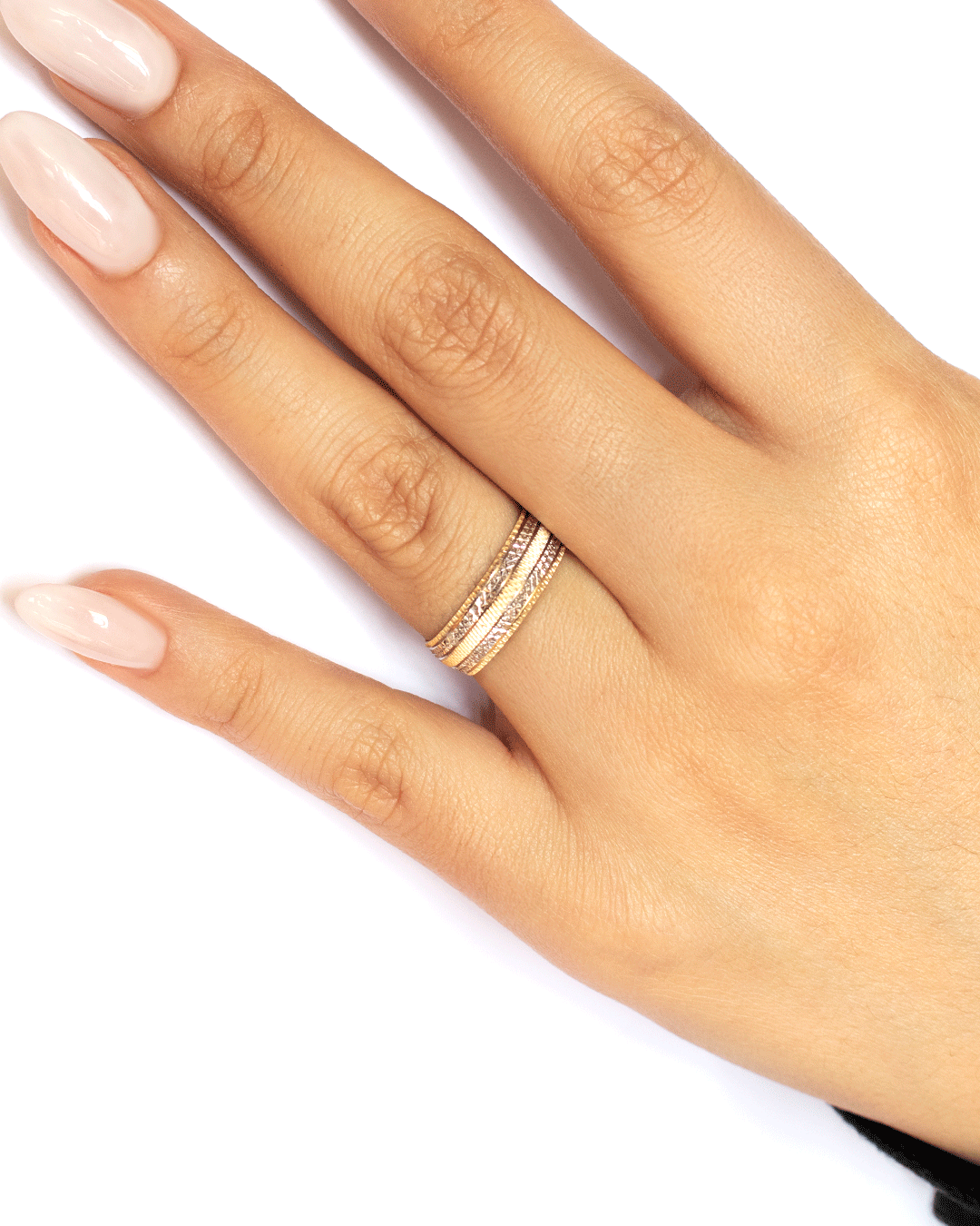 Argolla de Matrimonio con Grabado Geométrico y Franja Central en Oro Amarillo y Blanco 14k